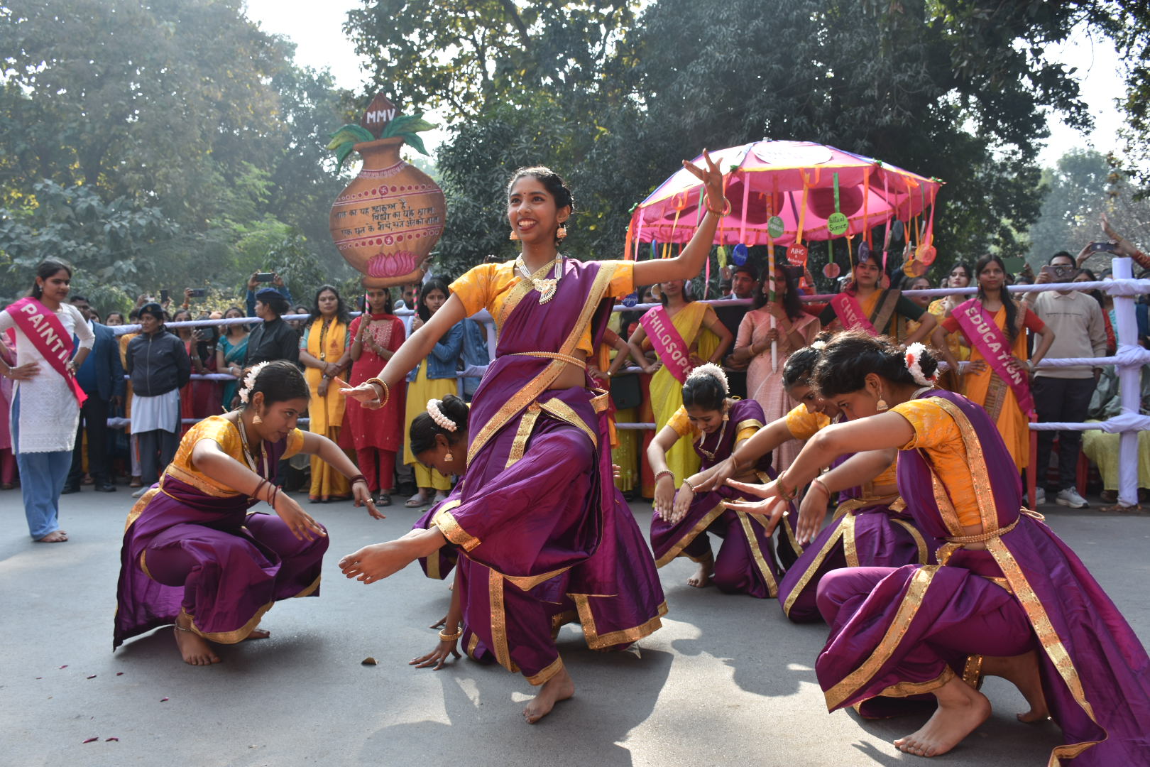 मुख्य मंच के समक्ष प्रस्तुतियों में सेन्ट्रल हिन्दू गर्ल्स स्कूल की छात्राओं ने सरस्वती वंदना पर नृत्य प्रस्तुत किया। वहीं सेन्ट्रल हिन्दू ब्वायज स्कूल ने लोकनृत्यों, अंतरिक्ष विज्ञान, स्वदेशी विचारधारा और खेल उपलब्धियों को झांकी के माध्यम से दर्शाया। रणवीर संस्कृत विद्यालय, महिला महाविद्यालय, कला, सामाजिक विज्ञान, शिक्षा, विज्ञान, प्रबंधन, वाणिज्य, कृषि, पशु विज्ञान, चिकित्सा विज्ञान तथा अन्य संकायों की झांकियों ने भारत की ज्ञान परंपरा और आधुनिक प्रगति के समन्वय को रेखांकित किया।