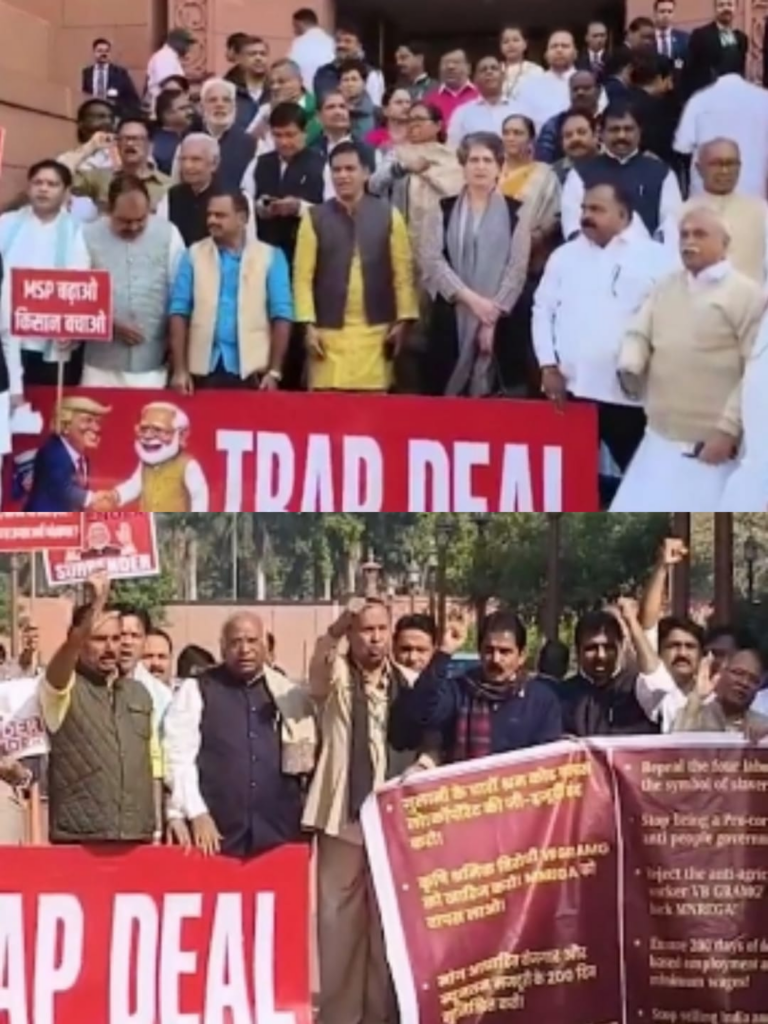 केंद्र सरकार की कुछ हालिया नीतियों और प्रस्तावित बिलों के खिलाफविपक्षी दलों ने तीखा हमला बोला है। कांग्रेस और अन्य विपक्ष के सांसदों ने संसद भवन के मकर द्वार पर जनहित की आवाज बुलंद करते हुए विरोध प्रदर्शन किया और आरोप लगाया कि प्रधानमंत्री मोदी ने अमेरिका के राष्ट्रपति डोनाल्ड ट्रम्प के दबाव में आकर भारतीय किसानों के भविष्य को खतरे में डाल दिया है। देश के सम्मान से खिलवाड़ किया है। देश उन्हें माफ नहीं करेगा।