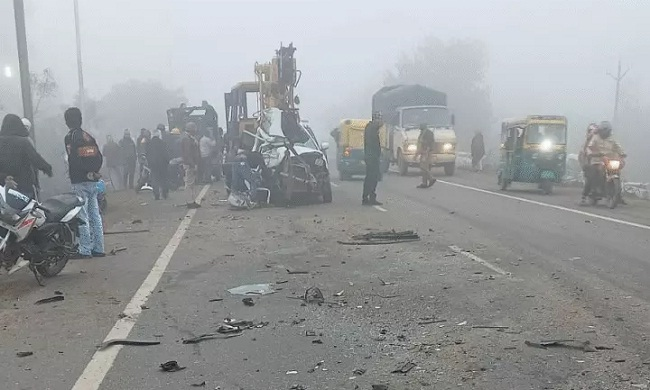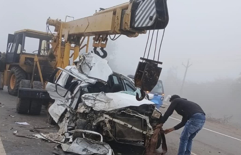 ग्वालियर, 30 जनवरी (हि.स.)। मध्य प्रदेश के ग्वालियर जिले के महाराजपुरा थाना क्षेत्र में शुक्रवार सुबह घने कोहरे के बीच एक तेज रफ्तार ट्रक ने वैगनआर कार को पीछे से टक्कर मार दी। इस हादसे में कार सवार चार लोगों की मौके पर मौत हो गई। मृतकों में दो महिलाएं और दो पुरुष हैं।