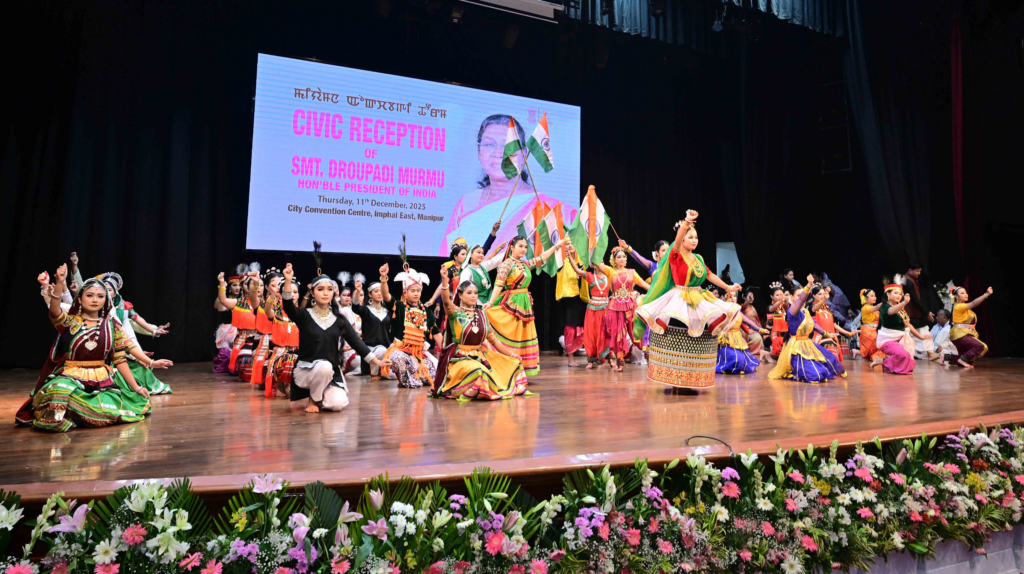 राष्ट्रपति श्रीमती द्रौपदी मुर्मु ने आज शाम (11 दिसंबर, 2025) इम्फाल के सिटी कन्वेंशन सेंटर में मणिपुर सरकार द्वारा उनके सम्मान में आयोजित नागरिक अभिनंदन समारोह में भाग लिया। इस अवसर पर उन्होंने विभिन्न विकास परियोजनाओं की आधारशिला रखी और उद्घाटन किया।पने संबोधित में राष्ट्रपति ने कहा कि मणिपुर लचीलेपन, साहस और असाधारण सांस्कृतिक समृद्धि की भूमि है। पीढ़ियों से, यहां के लोगों ने खेल, सशस्त्र बलों, कला और संस्कृति तथा सार्वजनिक सेवा सहित विभिन्न क्षेत्रों में अमूल्य योगदान देकर राष्ट्र को समृद्ध किया है।