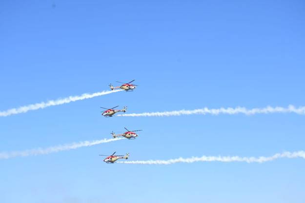 सारंग हेलीकॉप्टर की प्रदर्शन टीम और सूर्यकिरण एरोबैटिक टीम (एसकेएटी) द्वारा प्रस्तुत एक मनमोहक सिंक्रोनस फ्लाइंग डिस्प्ले, सीजीपी के भव्य समापन का हिस्सा था।