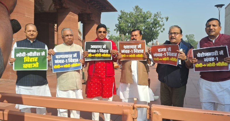 इससे पहले राष्ट्रीय जनता दल (राजद) के सांसदों ने मंगलवार को संसद भवन के मकर द्वार पर बिहार में बेरोजगारी, अपराध, बलात्कार, गरीबी, पलायन और अशिक्षा जैसे मुद्दों को लेकर प्रदर्शन किया। इस प्रदर्शन में राजद सांसद मनोज झा, प्रेम चंद गुप्ता और संजय यादव समेत कई सांसद शामिल हुए। इन सासंदों ने हाथों में बैनर और पोस्टर ले रखे थे।
