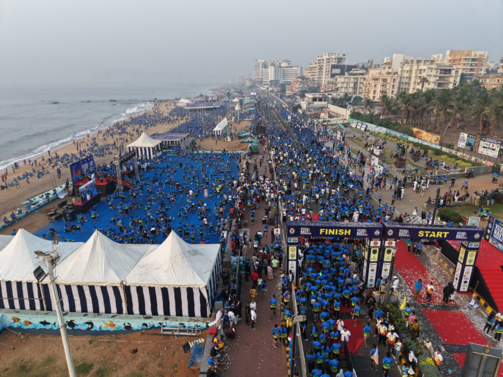 आज रविवार को आयोजित विशाखापट्टनम नेवी में मैराथन में 17 देशों के विदेशी नागरिकों सहित 17,000 से अधिक धावकों ने भाग लिया।मैराथन का 10वां संस्करण शानदार तरीके से संपन्न हुआ। इस आयोजन में जबरदस्त उत्साह और खेल भावना देखने को मिली। इस प्रतिष्ठित मैराथन में 17 देशों के विदेशी नागरिकों सहित 17,000 से अधिक धावकों ने भाग लिया, जिससे यह आयोजन एक नई मिसाल बन गया। 10 लाख रुपये से अधिक की इनामी राशि के साथ इस मैराथन ने देश-विदेश के खिलाड़ियों और फिटनेस प्रेमियों को एक मंच पर एकजुट किया।
