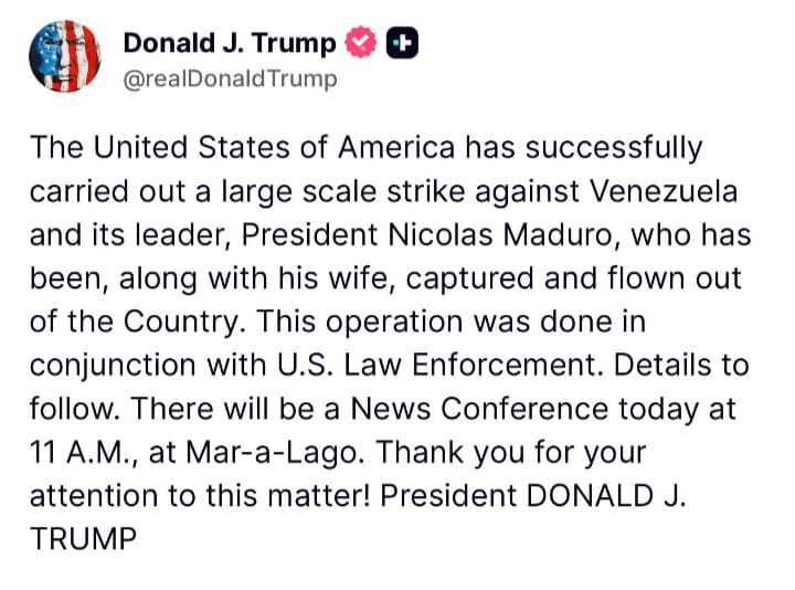 अमेरिका के राष्ट्रपति ट्रंप ने सोशल मीडिया प्लेटफॉर्म पर पोस्ट साझा कर कहा है कि उनके देश ने वेनेजुएला और उसके नेता राष्ट्रपति निकोलस मादुरो के खिलाफ बड़े पैमाने पर कार्रवाई को सफलतापूर्वक अंजाम दिया है। इसमें राष्ट्रपति निकोलस मादुरो और उनकी पत्नी को पकड़ लिया गया है और उन्हें देश से बाहर ले जाया गया है। यह कार्रवाई अमेरिकी कानून प्रवर्तन एजेंसियों के साथ मिलकर की गयी है।