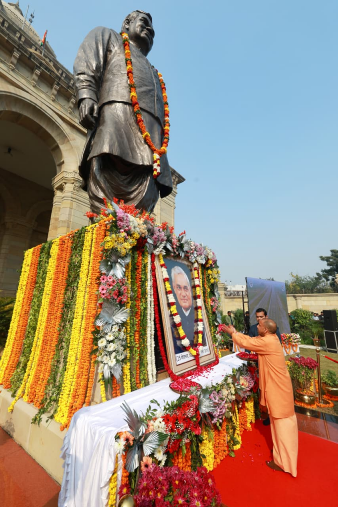 इस अवसर पर योगी ने कहा – अटल जी की पैतृक भूमि यूपी में होना सौभाग्य की बात है। अटल जी का विराट व्यक्तित्व प्रेरणास्रोत है। लखनऊ में राष्ट्र प्रेरणा स्थल का निर्माण किया गया है। अटल जी का जीवन राष्ट्र को समर्पित रहा है। राष्ट्र के विकास में जीवन समर्पित किया।अटल जी की स्मृतियां जीवंत रखनी हैं। लखनऊ से अटल जी का रिश्ता खास है। प्रदेशवासियों को सुशासन दिवस की बधाई।अटल जी हम सभी के लिए प्रेरणा है।अटल जी ने लोकसभा में यूपी का प्रतिनिधित्व किया।