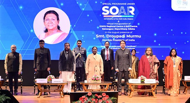 राष्ट्रपति आज राष्ट्रपति भवन के सांस्कृतिक केंद्र में आयोजित विशेष कार्यक्रम को संबोधित कर रही थीं। इस अवसर पर उन्होंने युवाओं को भविष्य की एआई प्रवीणता से जोड़ने के उद्देश्य से राष्ट्रीय जागरूकता अभियान ‘स्किल द नेशन चैलेंज’ का शुभारंभ किया। इसके साथ ही उन्होंने वर्चुअल माध्यम से ओडिशा के रायरांगपुर में इंदिरा गांधी राष्ट्रीय मुक्त विश्वविद्यालय (इग्नू) के क्षेत्रीय केंद्र और कौशल केंद्र का उद्घाटन भी किया। इस अवसर पर केंद्रीय शिक्षा मंत्री धर्मेंद्र प्रधान, कौशल विकास एवं उद्यमिता राज्य मंत्री (स्वतंत्र प्रभार) और शिक्षा राज्य मंत्री जयंत चौधरी सहित अनेक गणमान्य व्यक्ति उपस्थित रहे।