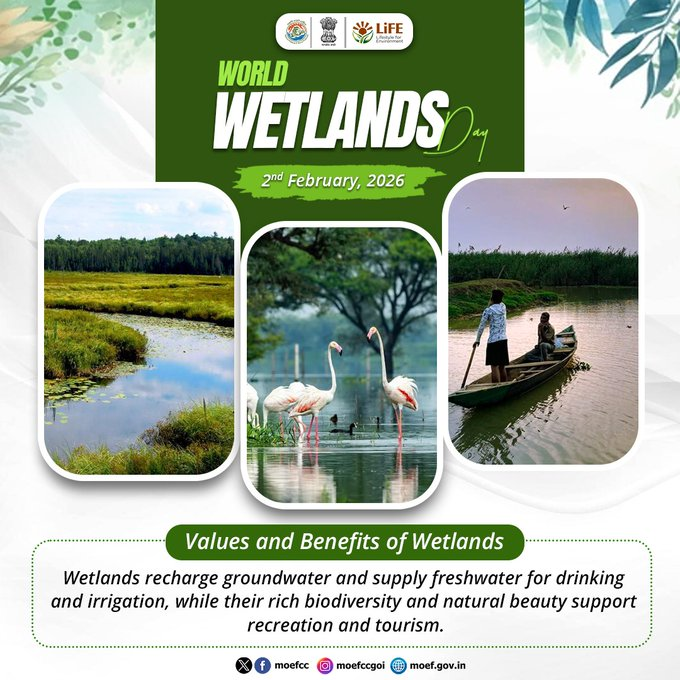 विश्व आर्द्रभूमि दिवस 2026 के अवसर पर सोशल मीडिया प्लेटफॉर्म ‘एक्स’ पर अपने संदेश में मंत्री ने कहा कि प्रधानमंत्री नरेन्द्र मोदी के पर्यावरण-संवेदनशील नेतृत्व में भारत ने वेटलैंड संरक्षण को समुदाय और संस्कृति से जोड़ा है। उन्होंने बताया कि 2014 में जहां भारत के केवल 26 रामसर स्थल थे, वहीं अब इनकी संख्या बढ़कर 98 हो गई है, जो देश की बड़ी उपलब्धि है।