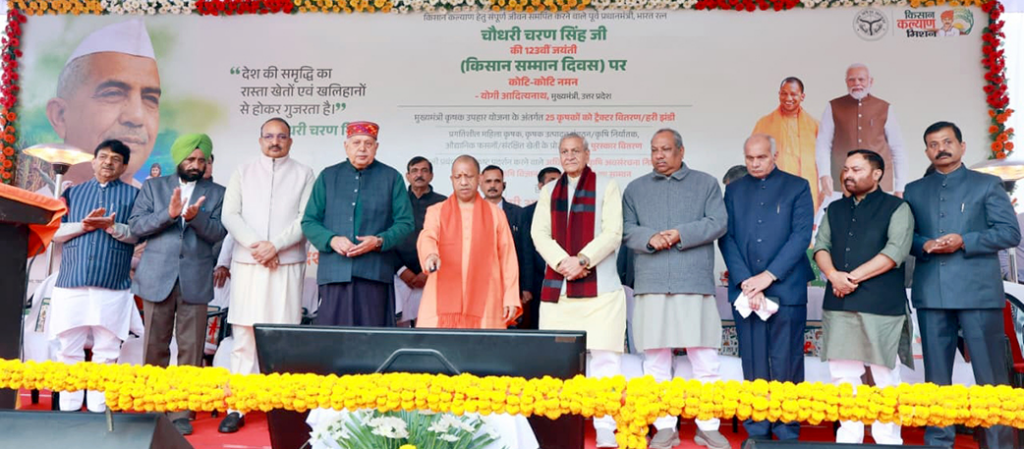 अब किसानों को मिलता है शासन की हर योजना का लाभ सीएम योगी ने कहाकि प्रधानमंत्री नरेंद्र मोदी ने किसानों के मसीहा, पूर्व प्रधानमंत्री व यूपी के पूर्व मुख्यमंत्री चौधरी चरण सिंह को ‘भारत रत्न’ देकर किसानों का मान बढ़ाया। लघु व सीमांत किसानों के लिए कृषि ऋण मोचन कार्यक्रम लागू किया। पहले किसान शासन की किसी भी योजना का अंग नहीं था, लेकिन आज किसान को शासन की हर योजना का लाभ प्राप्त हो रहा है। आज बिचौलिया किसानों की फसल का दाम नहीं तय करता। यदि किसान को बाजार में फसल का अच्छा दाम मिला तो ठीक वरना सरकार उसे खऱीदेगी। यूपी के अंदर धान, गेहूं, चना, सरसो, बाजरा, मक्का आदि फसलों का उत्पादन कई गुना बढ़ा है और लागत कम हुई है। यही किसानों की समृद्धि का आधार है।